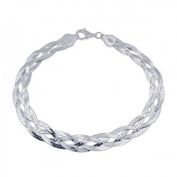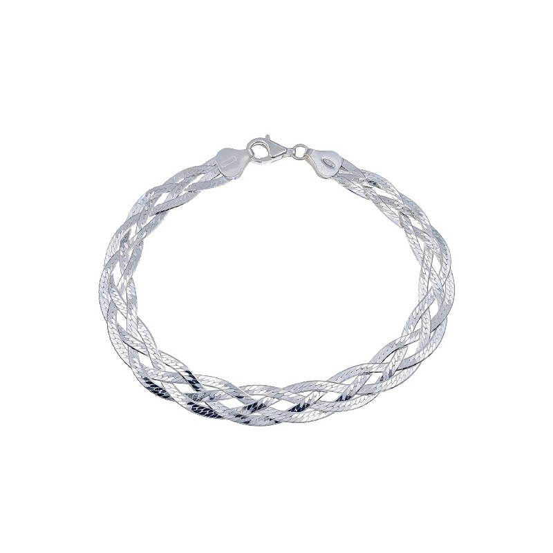 Pulsera fabricada en plata de ley 925 mm, de 1 cm de anchura, formando una trenza con cuatro hilos de plata. Cierre de mosquetón para mayor seguridad. Longitud: 18 cms + 4 cms de cadena alargadora. Se entrega en estuche de regalo.