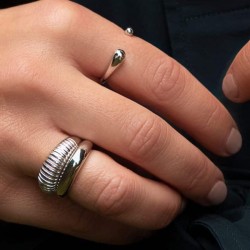 Anillo fabricado en plata de ley 925mm, abierto por la parte trasera y adaptable a cualquier medida, ya que puede abrirse o cerrarse. Cuenta con una rayas talladas en la misma pieza, en sentido vertical al anillo. Se entrega en estuche de regalo.
