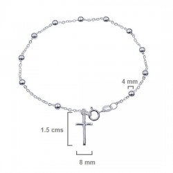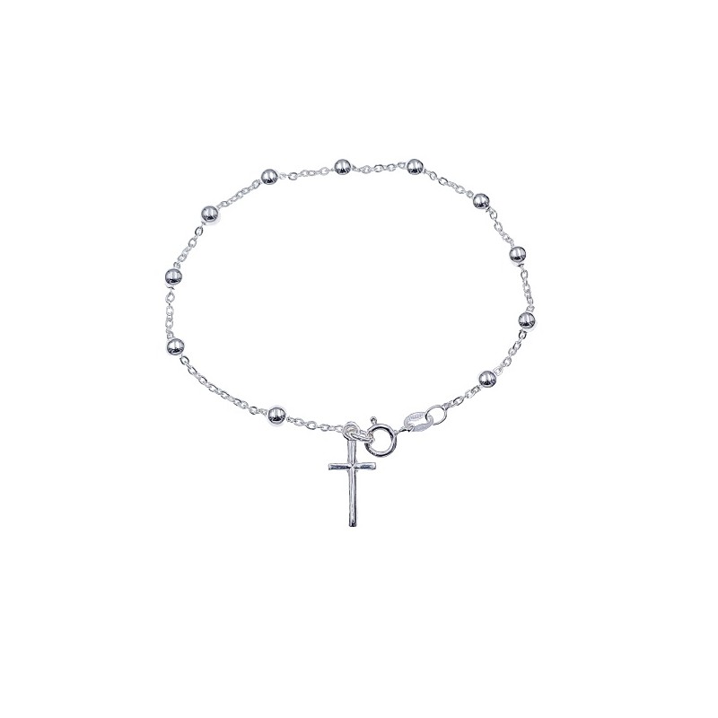Pulsera fabricada en plata de ley 925mm, estilo rosario con bolitas de 4MM de grosor y cruz de 1.5CM de alto y 8MM de ancho. Cierre de mosquetón. Se entrega en estuche de regalo.