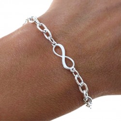 Pulsera fabricada en plata de ley 925 mm, eslabones de 4mm ancho y motivo central de infinito de 13 mm de longitud x 5 mm de grosor . Cuenta con una longitud total de17 cms + 3 cms de cadena alargadora, lo que permite su colocación a diferentes alturas en la muñeca. Se entrega en estuche de regalo. Entregas rápidas en 24-72 horas laborables a península.