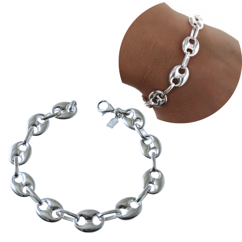 Pulsera fabricada en plata de ley 925 mm, con eslabones en forma de grano de café o calabrote de 1 cm de grosor. Se entrega en estuche de regalo. Entregas rápidas en 24-72 horas laborables a península.