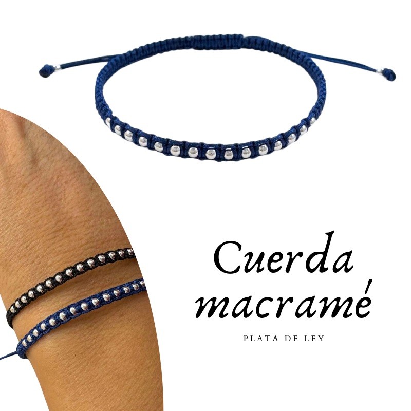 PULSERA CUERDA DE MACRAMÉ Y BOLITAS PLATA DE LEY ADAPTABLE, DOS COLORES A ELEGIR: AZUL O NEGRO
