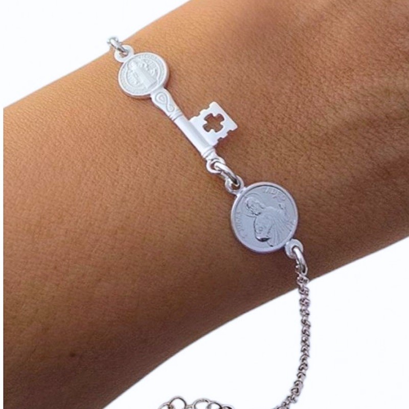 PULSERA PLATA DE LEY LLAVE SAN BENITO CADENA TIPO ROLO 17 CM + 2CM CADENA ALARGADORA