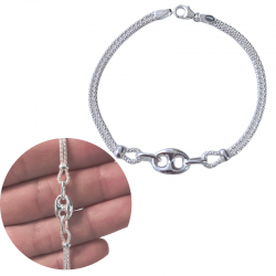 Pulsera de plata de ley con doble cadena coreana y eslabón calabrote central. Longitud de 18 cm. Diseño elegante y moderno. Entregas rápidas en 24 a 72 horas laborables a península. Se entrega en estuche de regalo. Envío gratis en pedidos superiores a 20 euros. Para compras inferiores el envío tiene un coste de 3 euros.