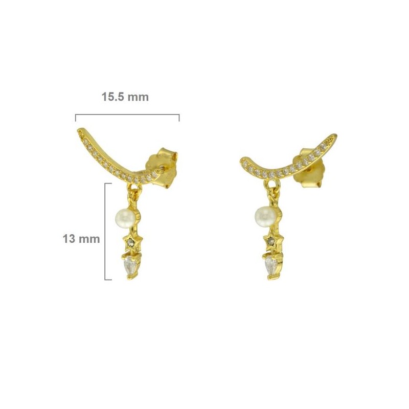 Pendientes fabricados en plata de ley bañados en oro de 18k, con cierre de presión tipo mariposa. Formado por una tira curva, con circonitas blancas, le cuelga una tira con circonitas en el extremo y una perlita central. Se entrega en estuche de regalo. Envíos rápidos a península.