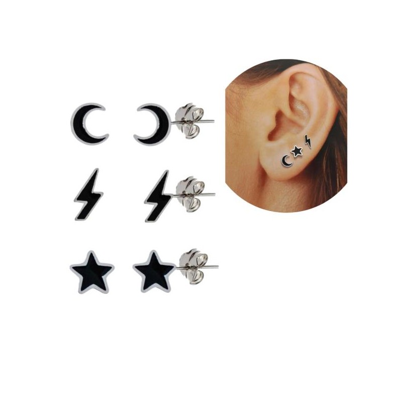 Pendientes fabricados en plata de ley 925 milésimas con cierre de presión tipo mariposa lacados en color negro, con 3 modelos diferentes a elegir en el momento de la compra : estrellas, rayos y lunas. Se entregan en estuche de regalo. Envíos rápidos a península en 24-72 horas laborables