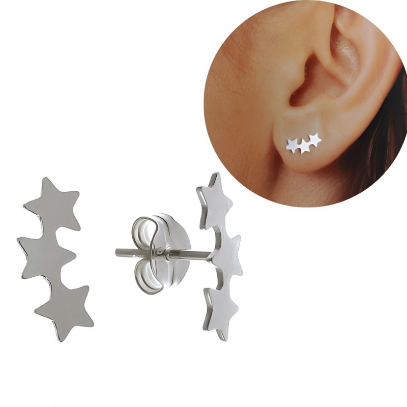 Pendientes fabricados en plata de ley 925 mm, en forma de tres estrellas juntas, en posición cóncava, con cierre de presión tipo mariposa. Se entregan en estuche de regalo. Dimensiones: 1.2 cms de altura. Entregas rápidas a península en 24-72 horas laborables.