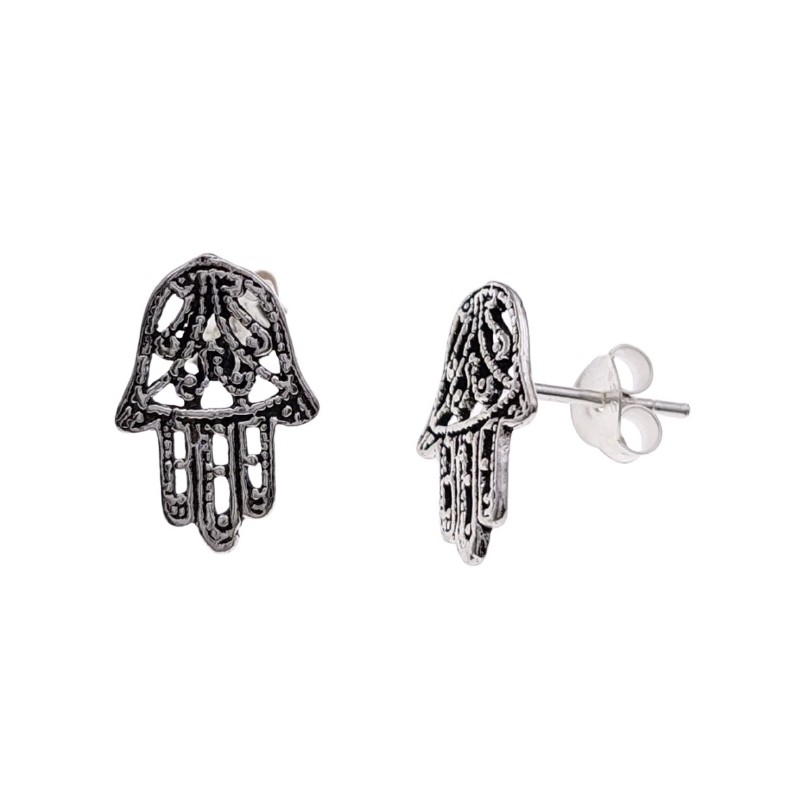 Pendientes fabricados en plata de ley 925 mm, con cierre de presión, en forma de mano de Fátima. Medidas: 1.4 cms de alto x 0.9 cms de ancho.