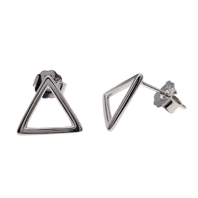 Pendientes fabricados en plata de ley 925 mm, en forma de siluetra triángulo de 10 mm por cada lado. Cuentan con un cierre de presión tipo mariposa. Se entrega en estuche de regalo. Entregas rápidas en 24-72 horas laborables a península.