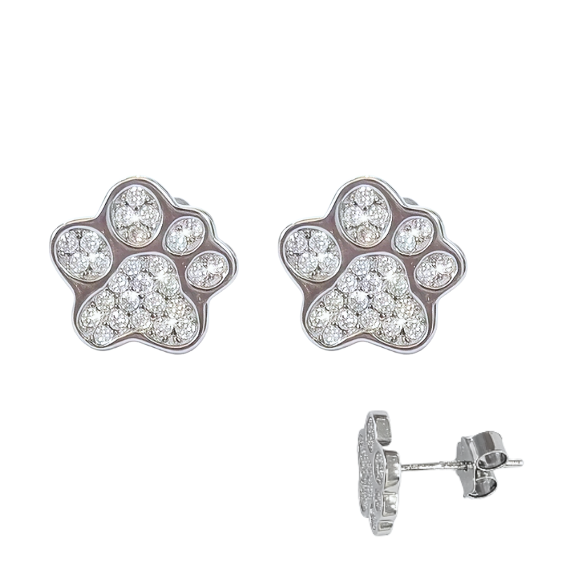 PENDIENTES PLATA DE LEY HUELLA DE PERRO CIRCONITAS BLANCAS CIERRE DE PRESIÓN