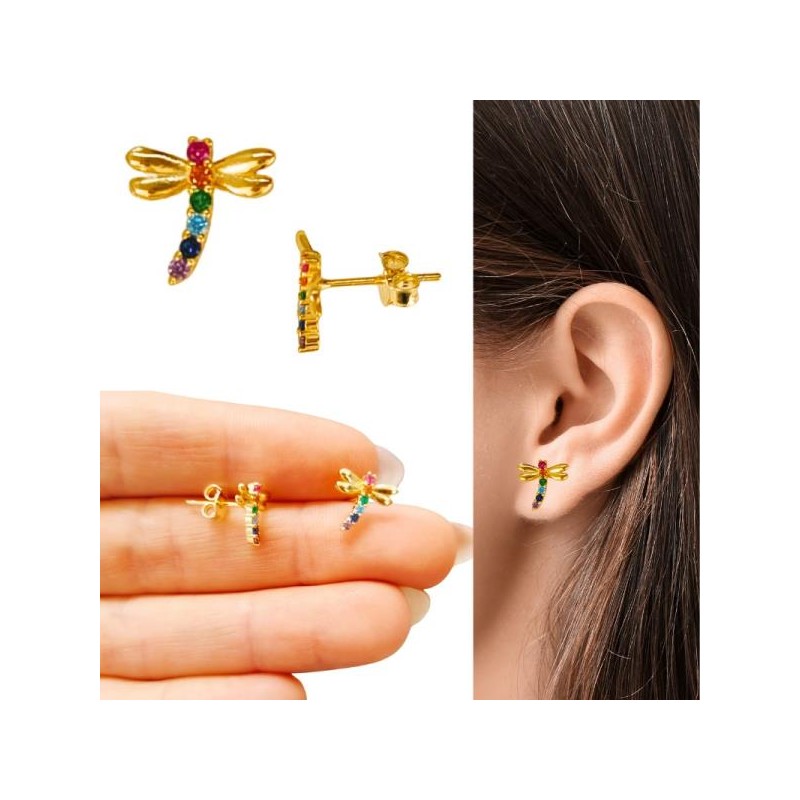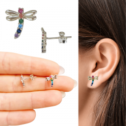 Pendiente de plata de ley o plata bañada en oro 18k con diseño de libélula decorada con circonitas de colores que aportan brillo y un estilo único. Con cierre de presión para mayor comodidad y seguridad. Ideal para regalar o lucir en cualquier ocasión. Se entrega en estuche de regalo. Entregas rápidas en 24 a 72 horas laborables a península. Envíos gratis desde 20 euros. Resto de pedidos 3 euros