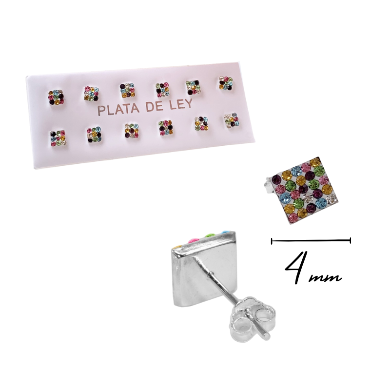 PENDIENTES PLATA DE LEY CUADRADOS 4 MM DE LADO, CIRCONITAS DE COLORES, CIERRE PRESIÓN
