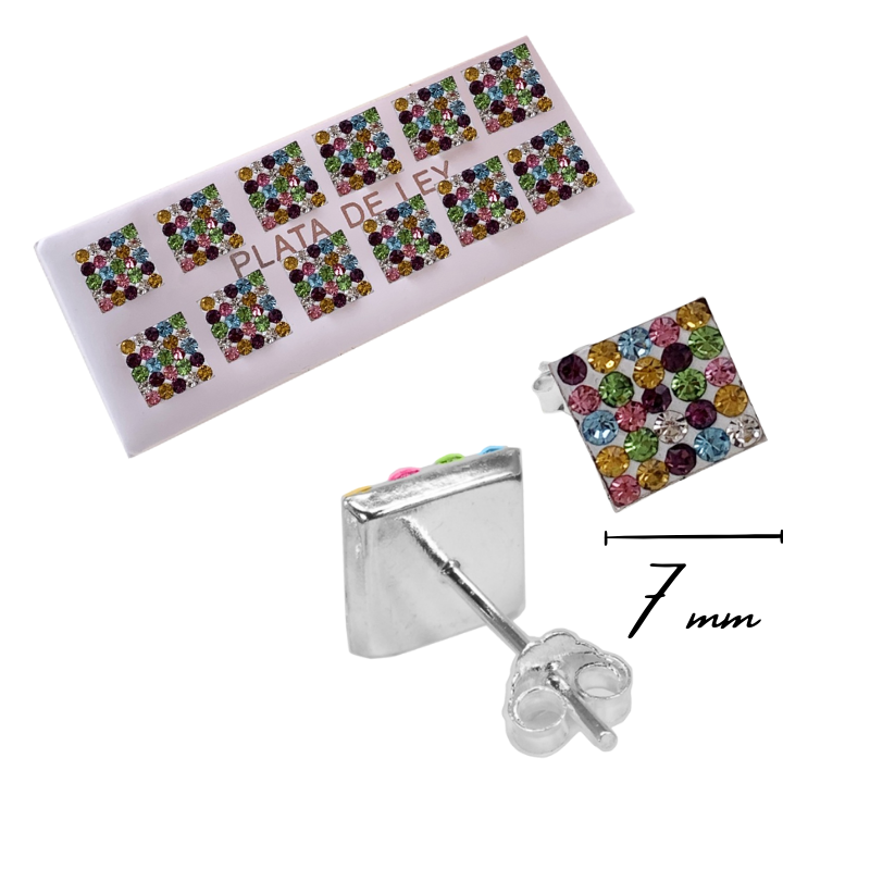 PENDIENTES PLATA DE LEY CUADRADOS 7 MM DE LADO, CIRCONITAS DE COLORES, CIERRE PRESIÓN