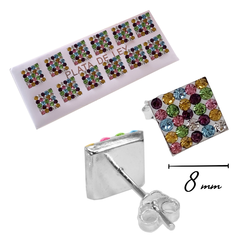 PENDIENTES PLATA DE LEY CUADRADOS 8 MM DE LADO, CIRCONITAS DE COLORES, CIERRE PRESIÓN