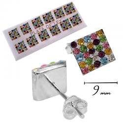 PENDIENTES PLATA DE LEY CUADRADOS 9 MM DE LADO, CIRCONITAS DE COLORES, CIERRE PRESIÓN