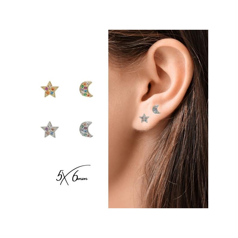 PENDIENTES PLATA DE LEY ESTRELLA Y LUNAS CIRCONITAS COLORES CIERRE DE PRESIÓN, 5 X 6 MM, DOS ACABADOS A ELEGIR