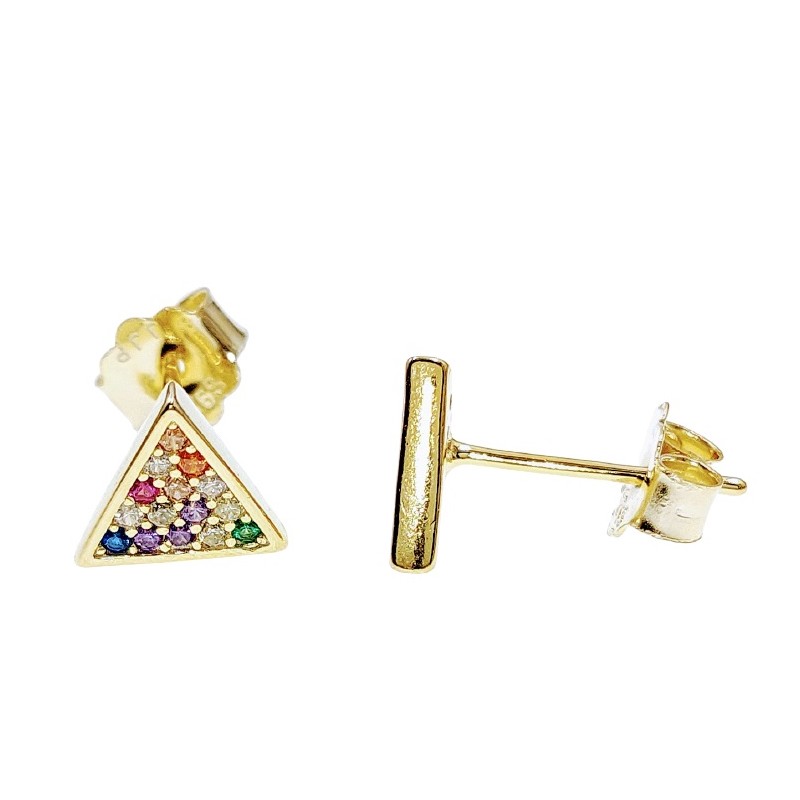 Pendientes fabricados en plata de ley 925 mm, chapados en oro de 12 kilates. Cierre de presión tipo mariposa. Circonitas de colores embutidas en la misma pieza. Medidas del pendiente: 8 mm de lado.