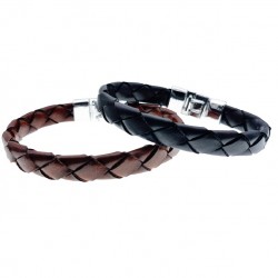 Pulsera fabricada en acero, con cuero trenzado a elegir entre marrón chocolate o negro, en el momento de la compra. Longitud: 22 cms