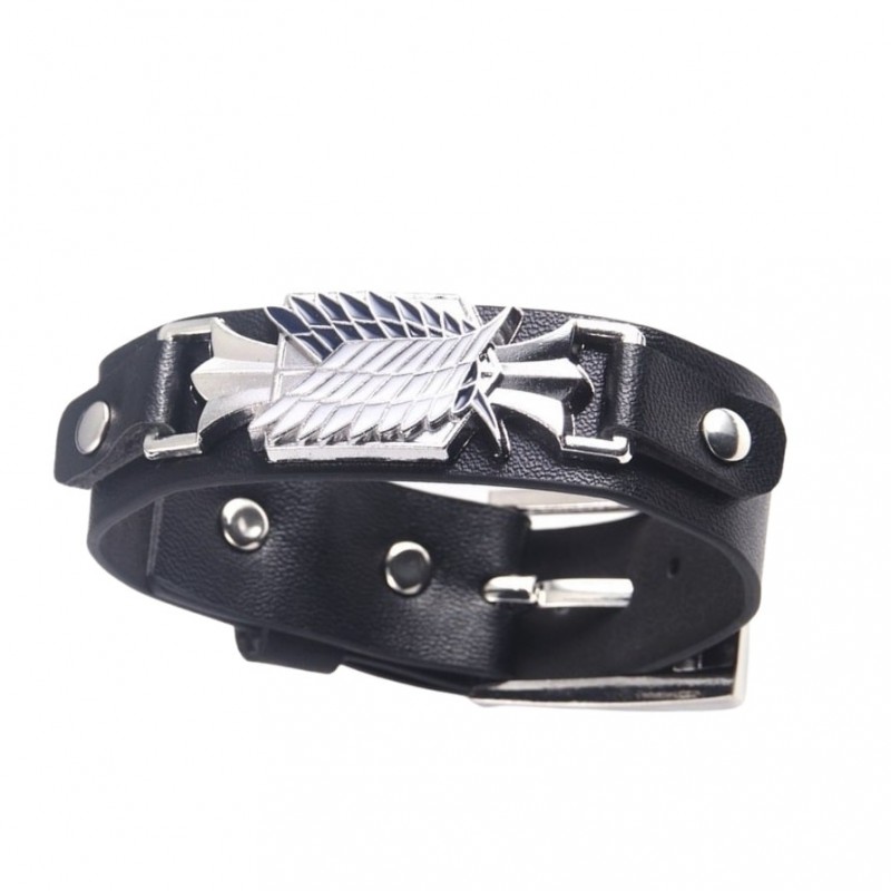 Pulsera fabricada en cuero y metal, con cierre de hebilla que permite su colocación a diferentes medidas. Basada en la serie Ataque a los titanes de Anime Shingeki no Kyojin. Cuenta con el emblema de la serie ( doble alas blanco-azul) en el centro. Se entrega empaquetada para regalo.