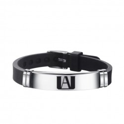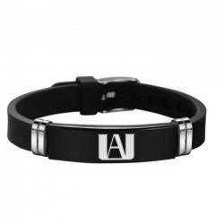 Pulsera fabricada en acero y caucho negro, basada en serie anime My hero academia. Cierre de hebilla que permite su colocación a diferentes medidas. Dos acabados a elegir en el momento de la compra: con la chapa central lacada en negro o en acero plateado. Logo de la academia grabado a laser en la parte central. Se entrega empaquetada para regalo.