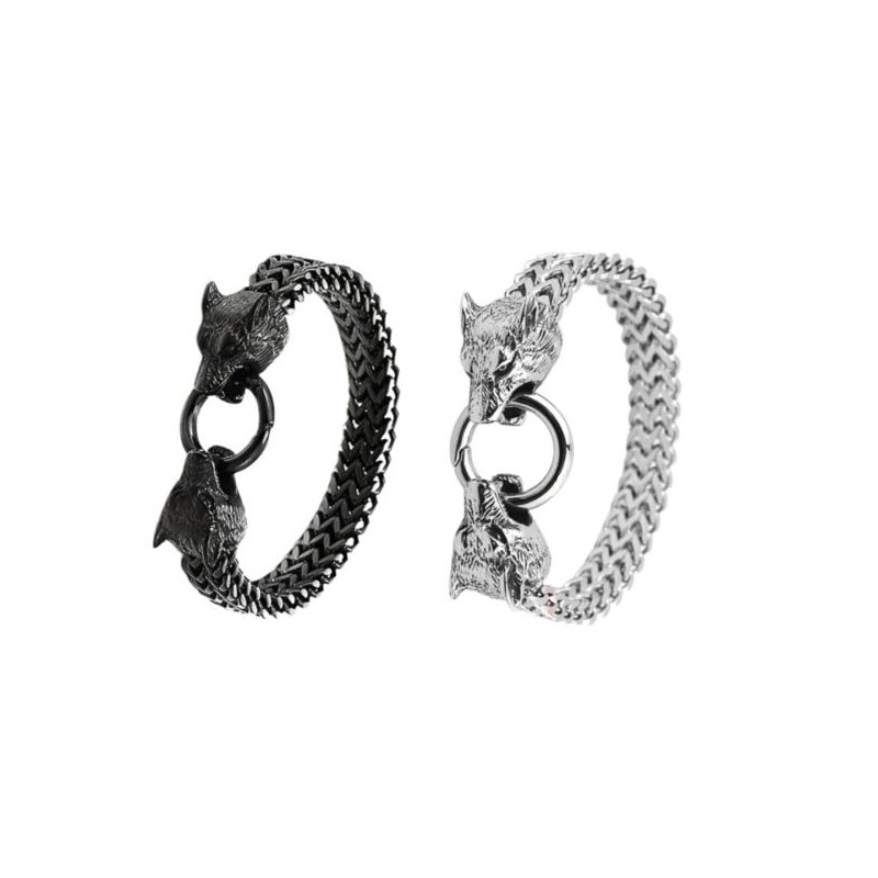 Pulsera fabricada en acero inoxidable, terminada en acero o lacada en negro. Cuenta con dos cabezas de lobo a ambos lados y con un cierre de bisagra central. Cuenta con una longitud total de 22 cms. Se entrega en estuche de regalo. Entregas rápidas en 24-72 horas laborables a península.