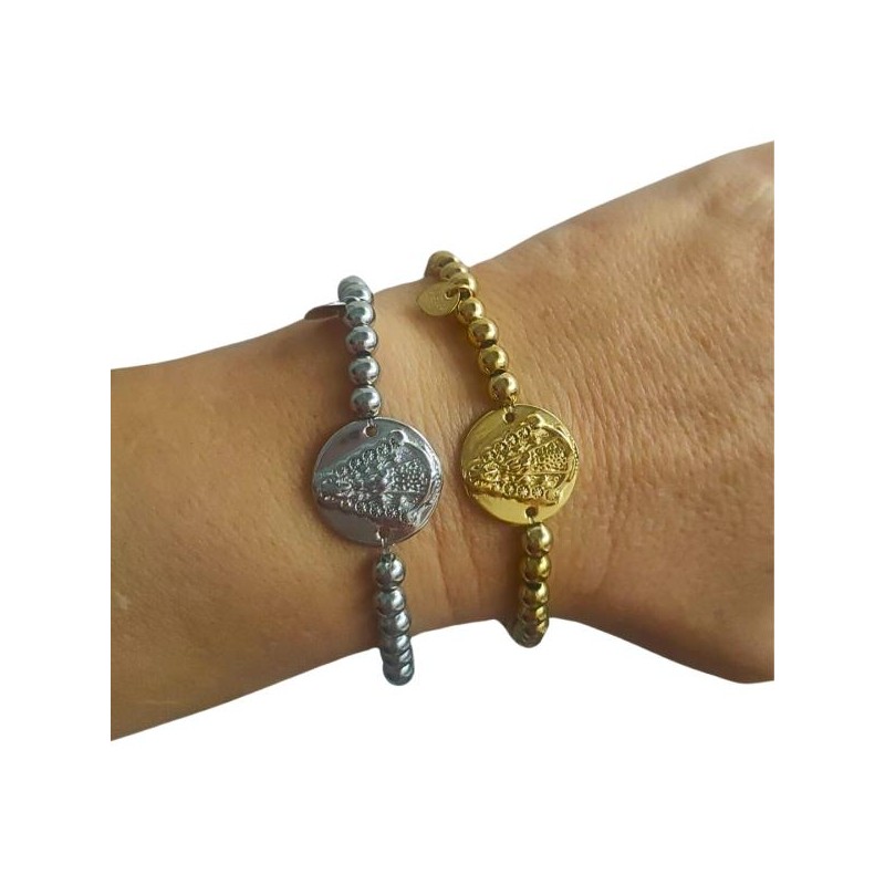 PULSERA ACERO INOXIDABLE VIRGEN DEL ROCÍO ELÁSTICA BOLAS DE 5 MM DIÁMETRO, VIRGEN CENTRAL DE 18 MM