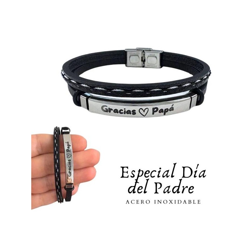 PULSERA ACERO Y CUERO DOBLE "GRACIAS PAPÁ" HILO BLANCO EN LA PULSERA SUPERIOR