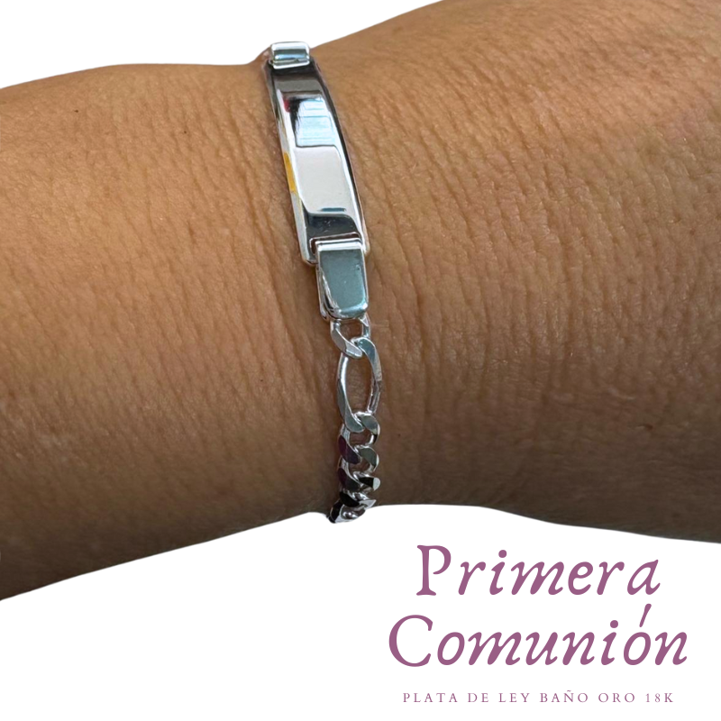 PULSERA PLATA DE LEY ESCLAVA ESPECIAL COMUNIÓN, PLACA DE 3 CM X 0.5 CM, PULSERA ESLABON 3+1