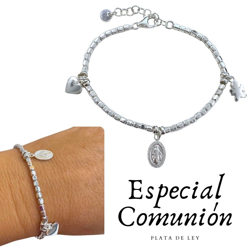 PULSERA PLATA DE LEY ESPECIAL COMUNIÓN VIRGEN DE GUADALUPE, ANGELITO Y CORAZÓN COLGANDO