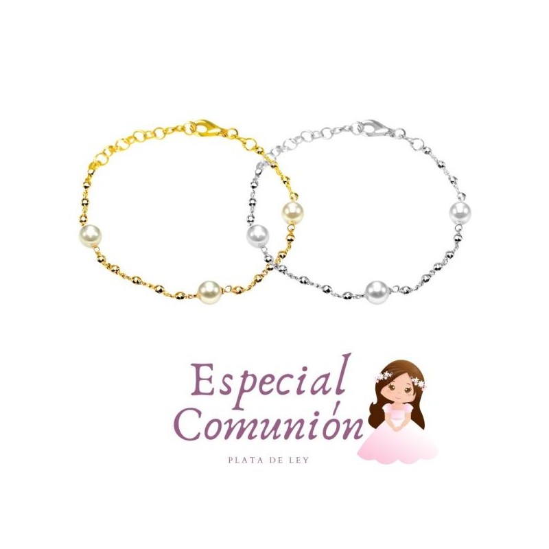 PULSERA PLATA DE LEY ESPECIAL COMUNIÓN PERLAS Y BOLITAS DE 3 MM, DOS ACABADOS A ELEGIR: BAÑO ORO O BAÑO EN RODIO