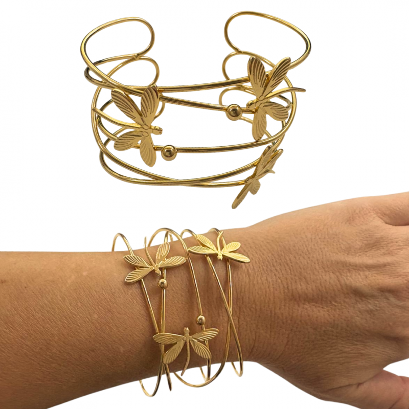Brazalete de acero inoxidable bañado en oro 18k con diseño de 5 hilos cruzados y detalle de libélulas. Elegante y original. Entrega rápida en 24 a 72 horas laborables a península. Envío gratis desde 20 euros. Incluye estuche de regalo. Perfecto para realzar cualquier look con un toque distintivo.