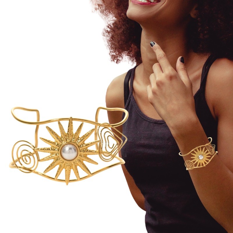 Pulsera de acero inoxidable con baño de oro 18K, diseño elegante con estrella central y perla blanca. Decorada con espirales a ambos lados. Abierta por detrás y totalmente adaptable. Se entrega en estuche de regalo. Envío gratis en pedidos desde 20 euros. Coste de envío 3 euros para el resto. Entregas rápidas en 24 a 72 horas laborables a península.
