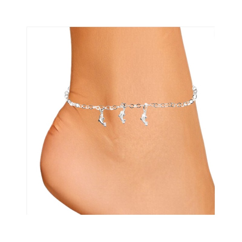 Tobillera fabricada en plata de ley 925 milésimas en forma de cadena con tres delfines colgando . Longitud de las tobillera 21 cm + 5 cms que permite su colocación a diferentes medidas . Se entrega en estuche de regalo . Envíos rápidos en 24-72 horas laborables a península.
