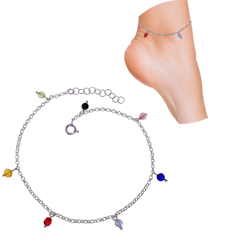 Tobillera fabricada en plata de ley con cadena rolo de 22 cm largo + cadena adaptable de 3 cm con motivo piedras de colores de 4.2mm de diámetro, colgando. Se entrega en estuche de regalo. Entregas rápidas a península en 24-72 horas laborables.
