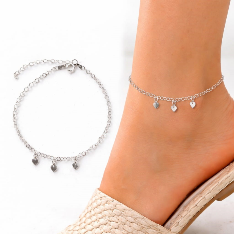 Descubre la tobillera de plata de ley con eslabones redondos y tres corazones colgando en el centro. Mide 21 cm con 5 cm extra para un ajuste perfecto. Ideal para regalo. Entregas rapidas en 24 a 72 horas laborables a peninsula, en estuche regalo. Envios gratis desde 20 euros, resto 3 euros.